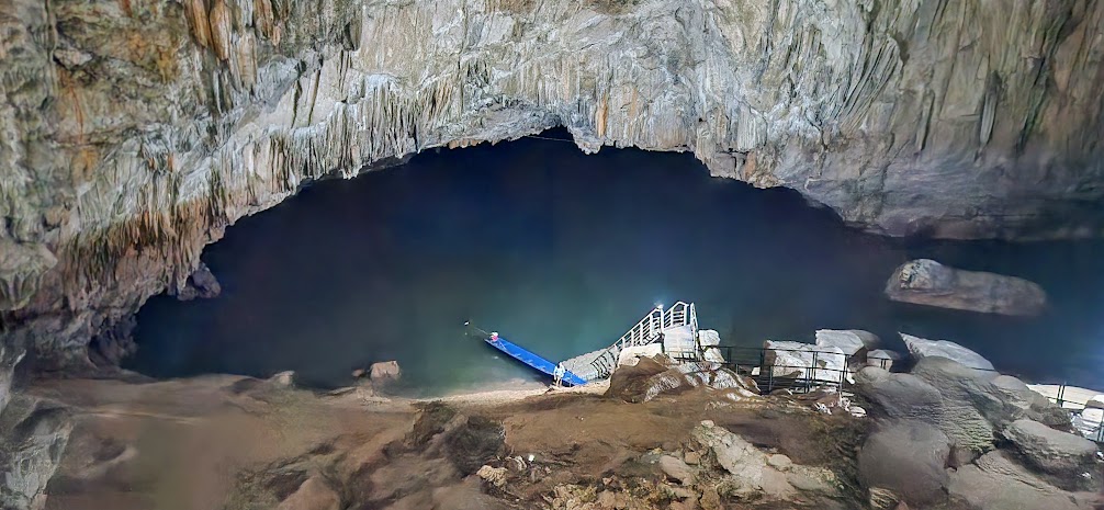 Continuing inland, the route reaches Kong Lor Cave, one of the most unforgettable highlights of motorbike travel in Laos. The ride in passes through quiet villages and rice fields beneath towering limestone cliffs. Inside, a boat journey takes you 7.5 kilometres through the mountain along an underground river, with vast caverns illuminated only by headlamps – a truly unique and surreal experience.